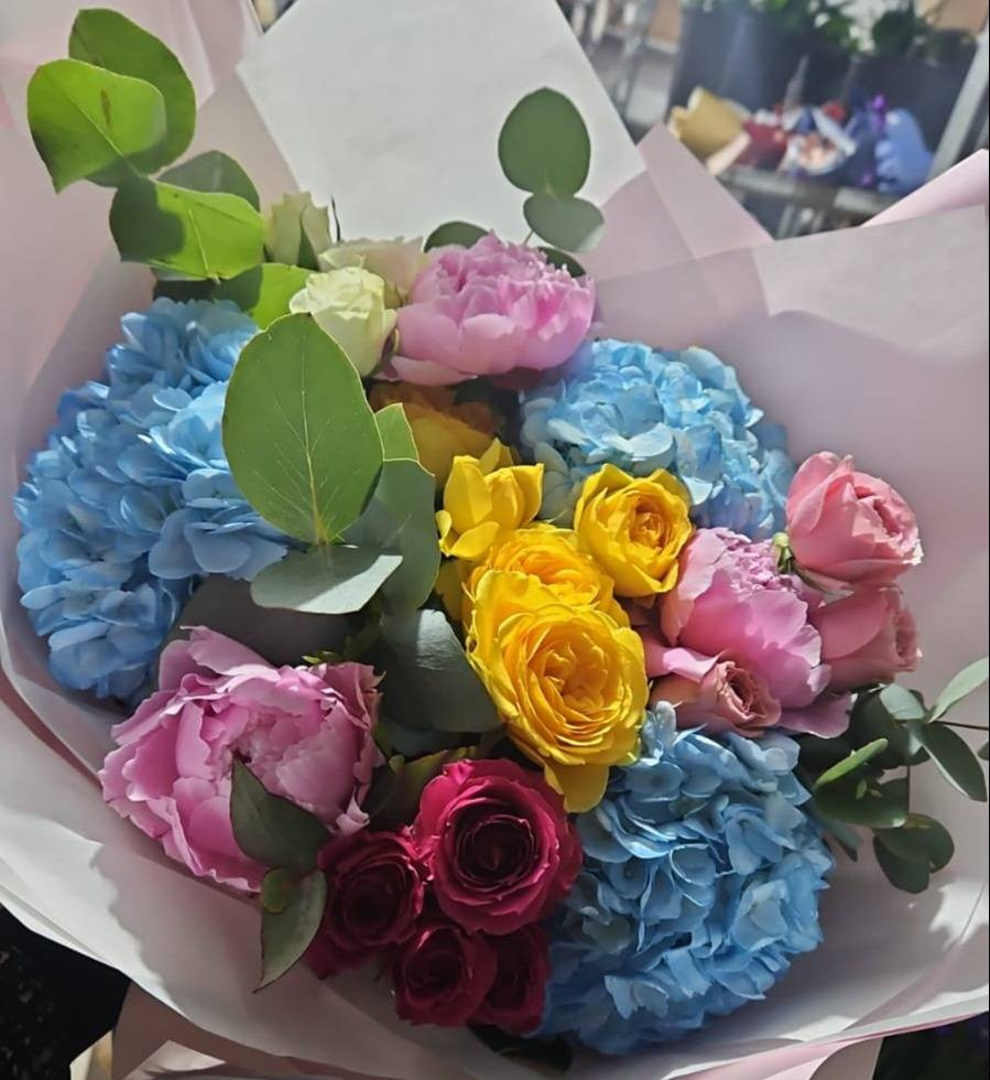 Buchetul conține hortensie, miniroze, bujori, ranunculus, eucalypt, ambalaj și panglică.