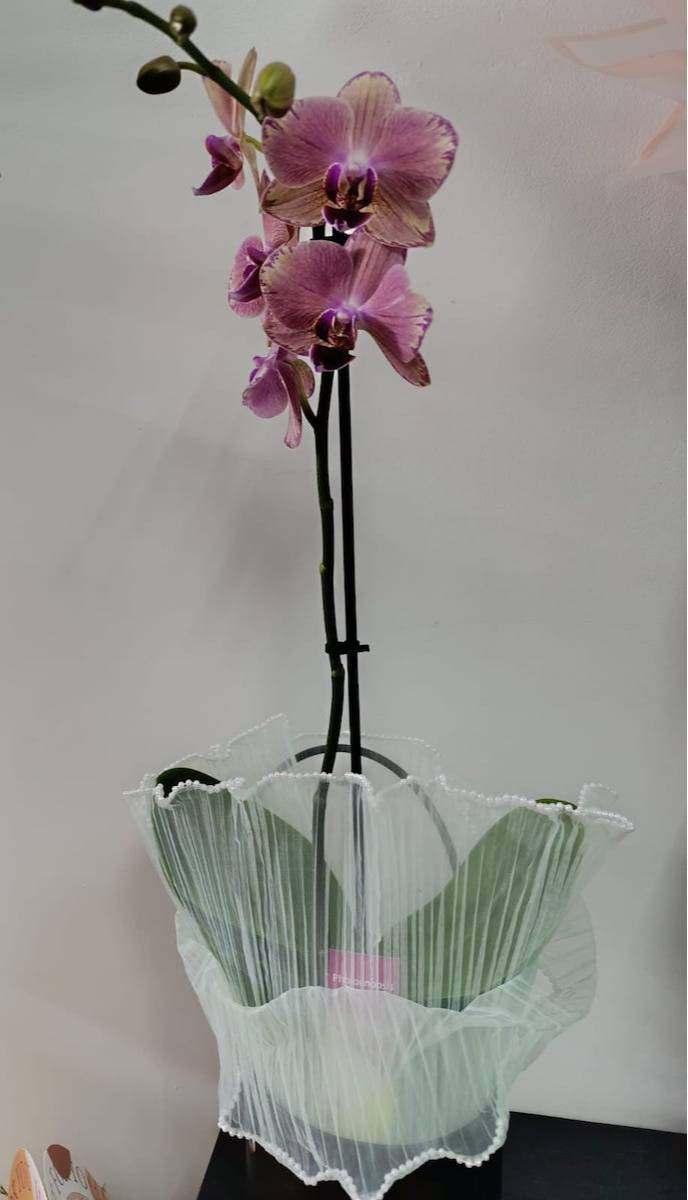 Aranjamentul conține Orhidee Phalaenopsis cu o tijă florală în cutie.